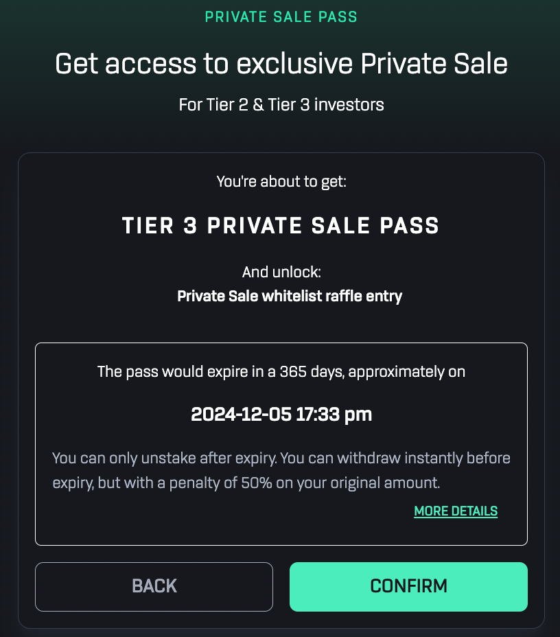 2. After staking successfully, click ‘Get Tier 2/ 3 Private Sale Pass Now’ and confirm the necessary transaction.