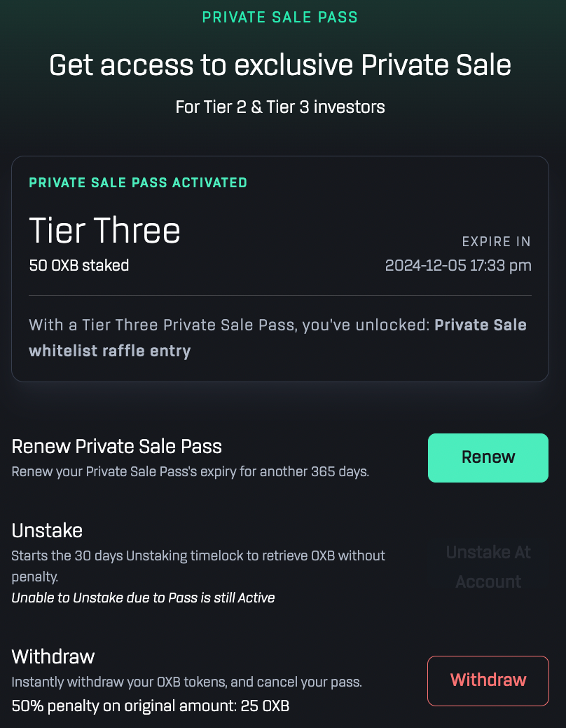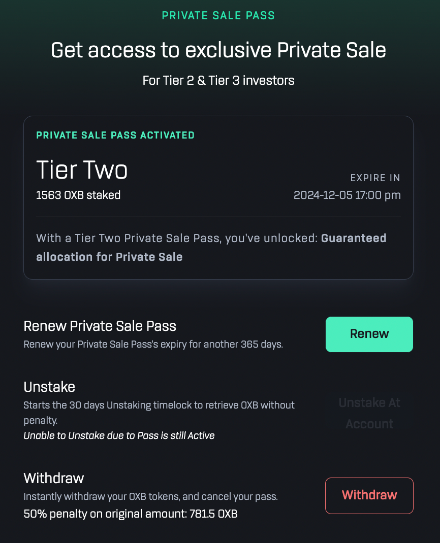 The Private Sale Pass will only be valid for 365 days. In addition to the usual eligibilities of each tiers, holders of the pass will also be eligible to participate in Private Sales held via Oxbull. The pass will expire after 365 days. Investors can either choose to renew the Private Sale Pass or unstake. Unstaking will carry the usual 30 day waiting period.