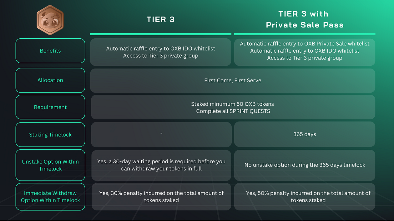 For our Tier 3 investors, it is key to understand the specific process associated with the Private Sale Pass. Obtaining a Tier 3 Private Sale Pass and completing all SPRINT QUESTS grants you entry into a raffle for a spot on the Oxbull Private Sale whitelist ONLY and DOES NOT guarantee a whitelist spot.