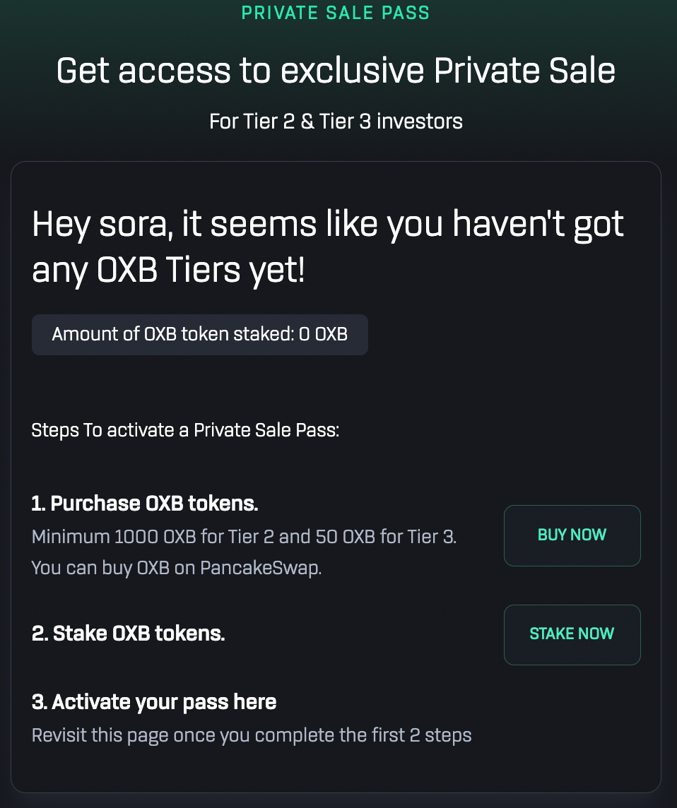 Go to https://oxbull.tech/app/private-sale-pass to buy and stake OXB.